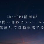 - ChatGPT活用事例:#3 生成AIで、お問い合わせフォーム(Google Form)を簡単に作成できますお問い合わせフォームを作りたいけど、どうしたら良いのだろう?Googleフォームで画面でポチポチ設定してお問い… 続きを読む: ChatGPT活用事例:#3 生成AIで、お問い合わせフォーム(Google Form)を簡単に作成できます